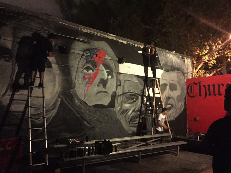 The artists were commissioned to paint the murals by the man in charge of the outdoor renovation, Nassie Shahoulian aka Notorious Nastie. According to one of the artists, Nastie chose the punk depiction of the presidents for the largest mural in the outdoor stage area. Patriotic or Patriarchal? Previously there was a mural of Winston Churchill, so I guess with our current political atmosphere, the idea was to promote some American pride. The muralists altered the presidents to make them look more ethnic and punk rock.