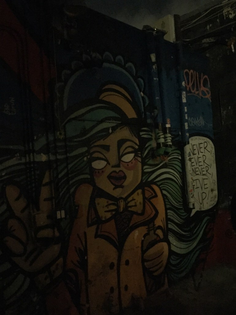 Pay attention to the writing on the wall: “Never, ever, ever give up.” @delvs102 Here’s a lady with some cool hair and outfit from a woman artist sending out a positive message amidst the smoke and debauchery– Never Give Up!