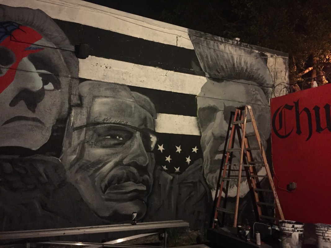 Last night, on Tuesday May 24, 2017, for those who came out to see the lineup of local bands making music on the main stage or just to have a drink with friends, there was live mural spray painting back under the stars where roaches (both kinds) often linger.