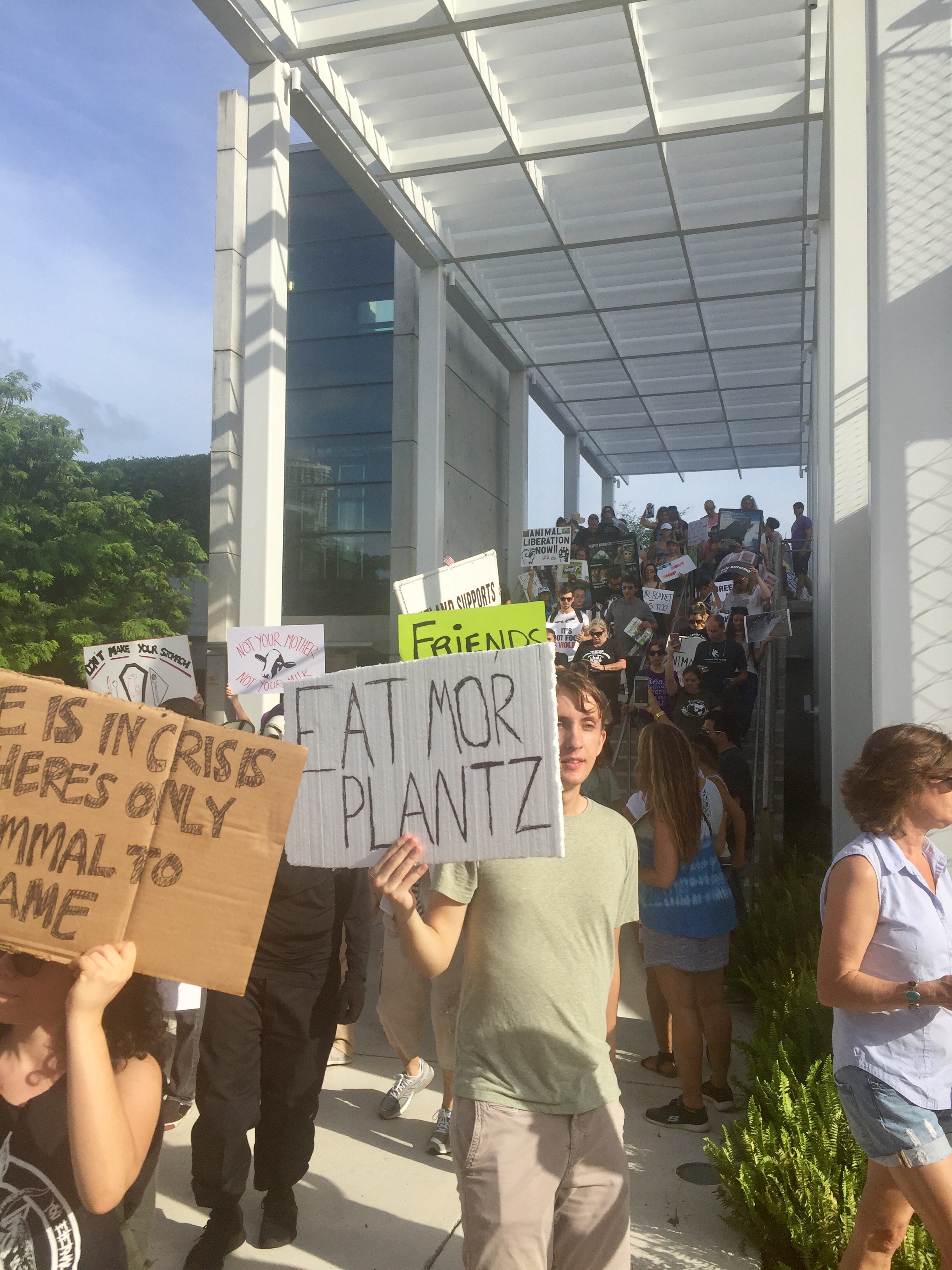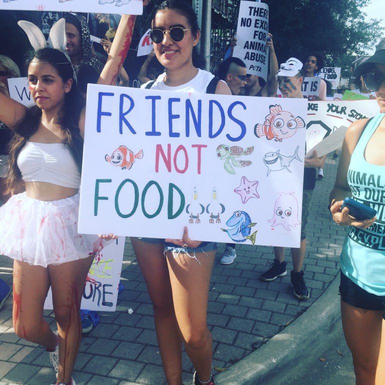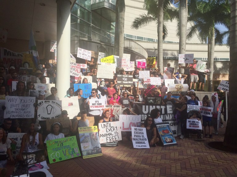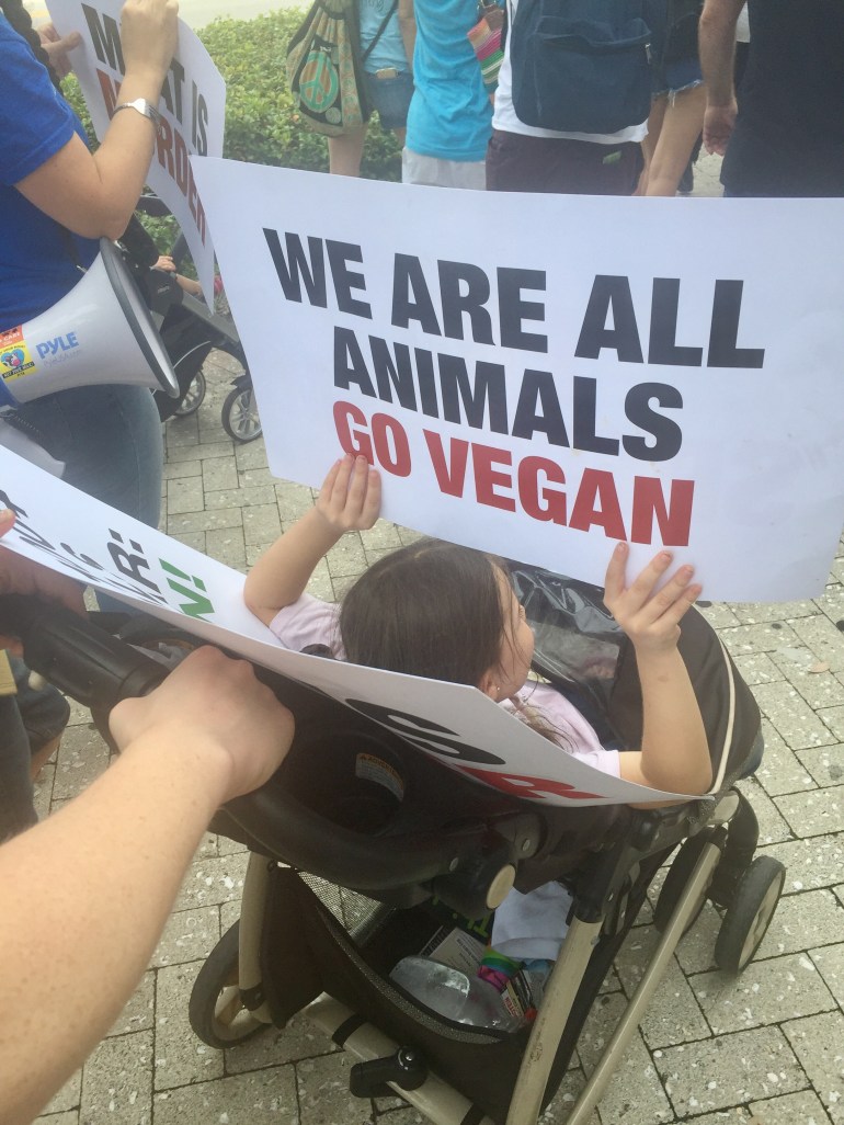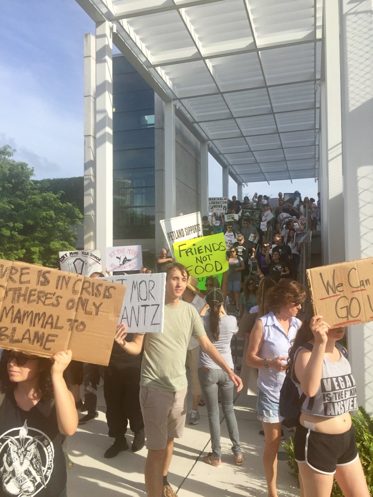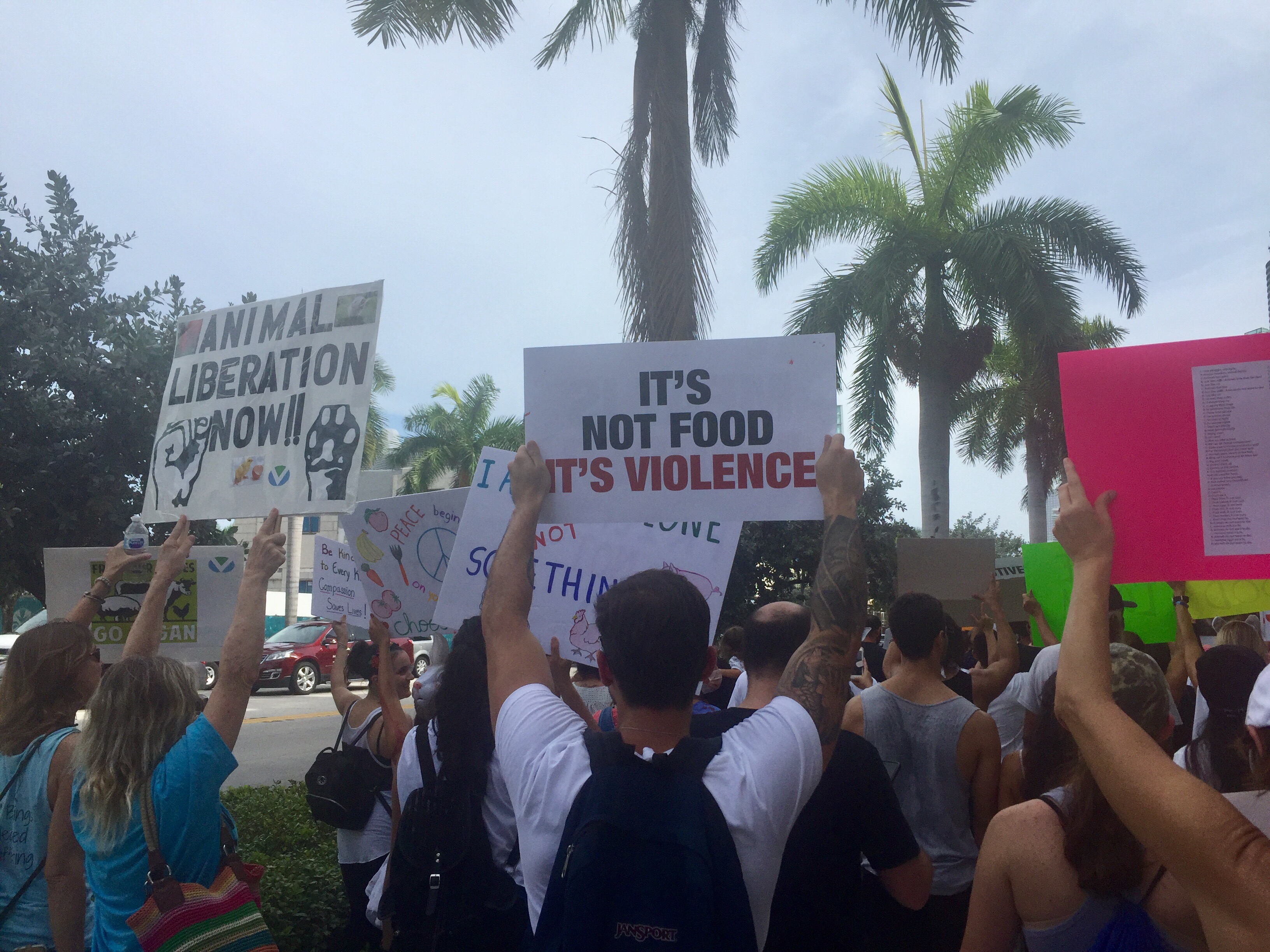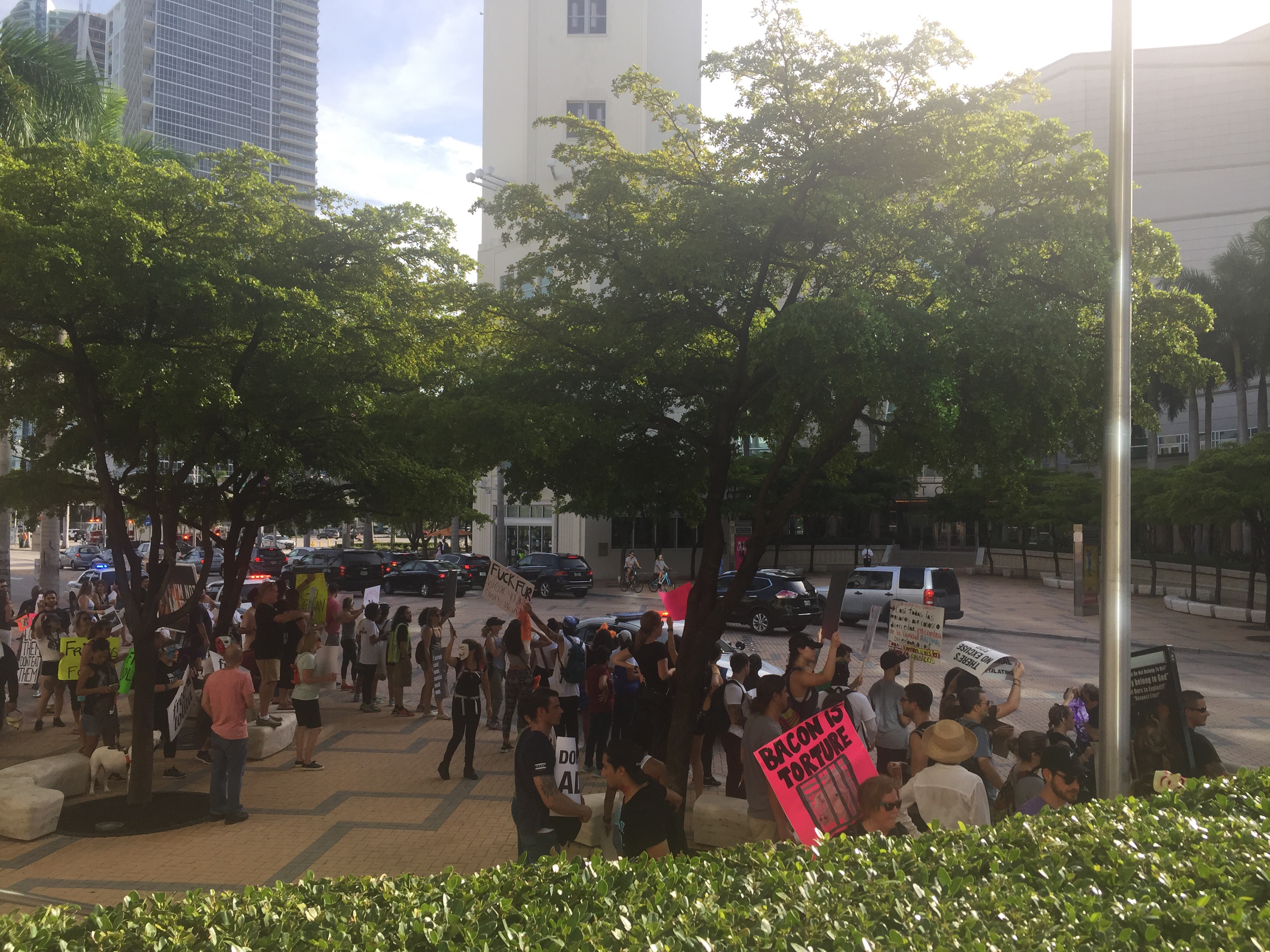 On September 2, 2017 about 300 people marched through downtown Miami with signs to protest the systematic exploitation and abuse of animals in the meat, dairy, fashion, entertainment and other industries.
