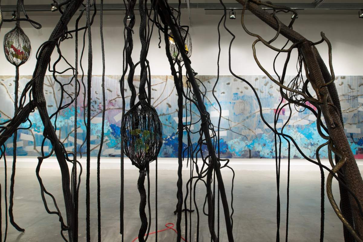 But overall, the artists, who dubs herself an eco-feminist, expresses a more poignant message through her art. The red thread mentioned in the show’s title is a piece of red rope that she placed at the entrance of the enormous mangrove labyrinth, which is poised in the center of the museum’s exhibition space. It is a reference to Ariadne’s thread from Greek mythology. In the tale, Ariadne gave a ball of red thread to Theseus so he could trace his steps on his journey through the maze to locate (and kill) the monstrous Minotaur.