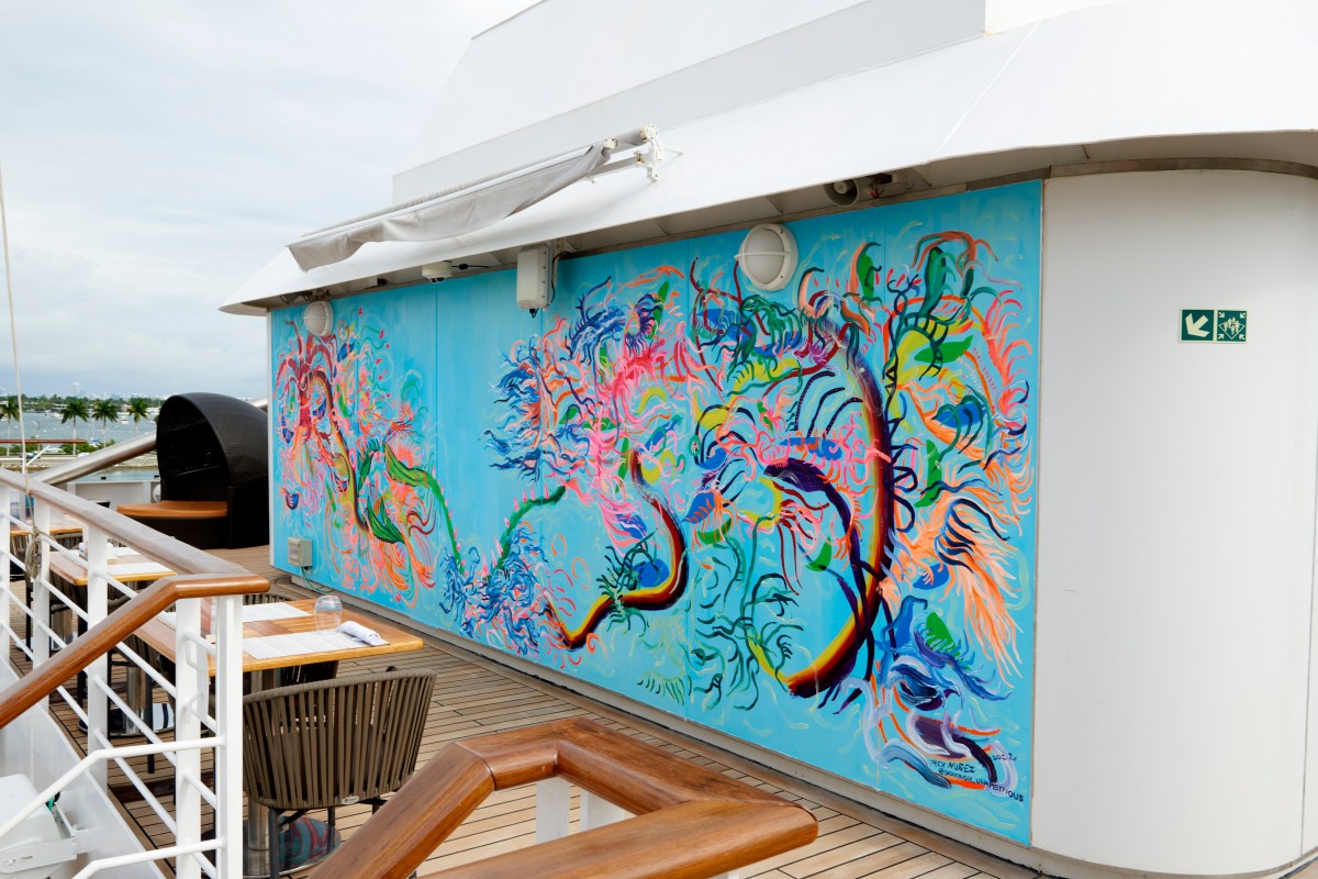 Nuñez is a Cuban-American mixed media painter from Miami whose work alternates between the floor and the wall, using spontaneous mark-making and bold splashes of color, she layers acrylic paint, glitter, crystals, ink, and collaged imagery. Earlier Windstar mural installations include works from artist Magnus Sodamin on Star Pride, and we are nice’n easy on Star Breeze. All muralists were selected by Fountainhead Arts, a Miami-based arts organization dedicated to elevating and supporting artists.